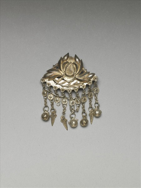 以敲花銀片作番蓮紋簪首,下接九條由銀鍊串成的流蘇,中央有菊花形飾片,尾端串有葉形或鈴鐺墜角,流蘇間以銀環串連。素長方片狀短挺。