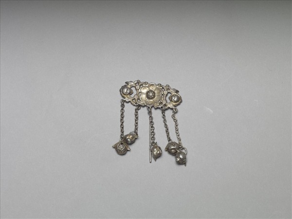 步搖,銅銀合金,以敲花為飾。簪首中央為六瓣花,兩側飾一對雙錢及蝙蝠,有「全福」之意。下有五條由銀鍊串成的流蘇,各綴一敲花花卉紋桃形墜角,素圓挺。