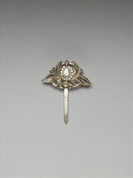 髮簪,以敲花銀銅合金片作番蓮紋簪首,扁平素挺。