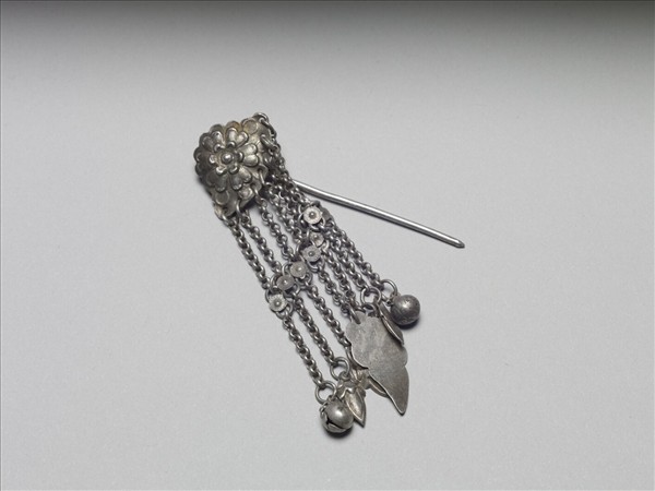 步搖,銀銅合金。雲形簪首,上以敲花做兩層六瓣花朵紋,下方綴有七條銀鍊流蘇。每條流蘇中間均飾有圓形菊花紋銀片。流蘇尾端綴有鈴鐺或葉形墜角,素圓挺。