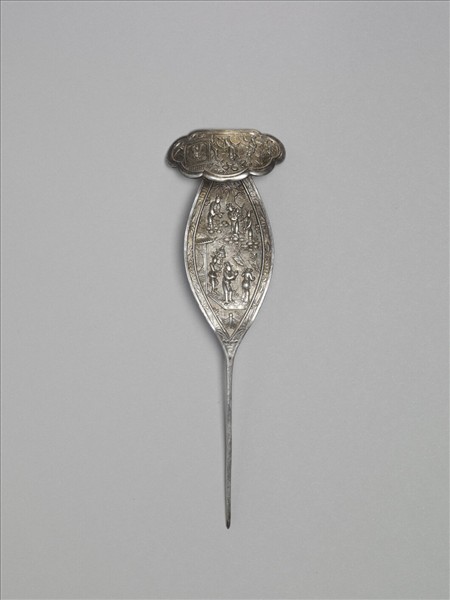 髮簪,銀銅合金,以敲花為飾。如意雲首反折接橄欖形簪首,如意雲首中飾花鳥紋。橄欖形簪首中飾「送子圖」,空中有一仙人手抱嬰孩,地上人物手中持藩旗、傘蓋等物,列隊迎接 ;圖案隙地為格紋錦地,外側有花葉紋邊飾。扁平素挺。