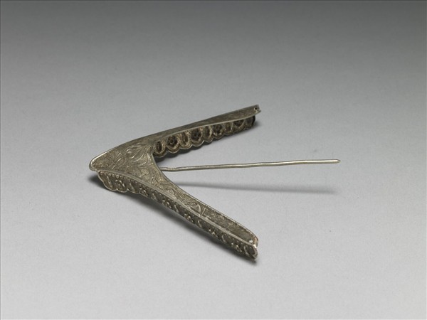 箭形髮簪,銀銅合金。簪首以敲花鏨刻為飾,正面飾花卉紋,側面飾五瓣花及水滴形紋。素圓挺。