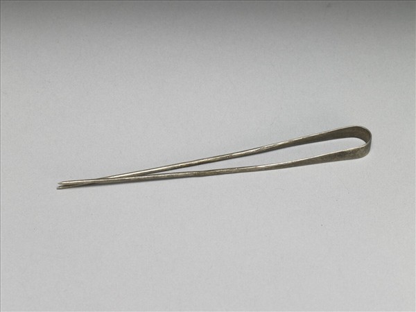 髮釵,銀銅合金。由一根長絲中間一段敲平呈長梭形後對折,兩端尖,全器光素無紋。