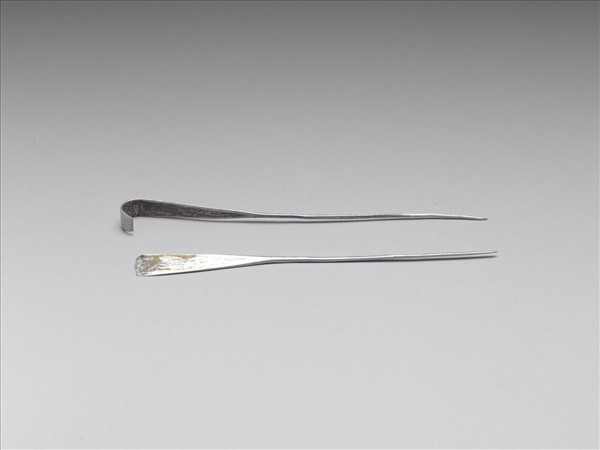 髮釵,銀銅合金。由一根長絲中間一段敲平呈長梭形後對折,兩端尖,全器光素無紋。本件傷斷。