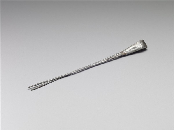 髮釵,銀銅合金。由一根長絲中間一段敲平呈長梭形後對折,兩端尖,全器光素無紋。