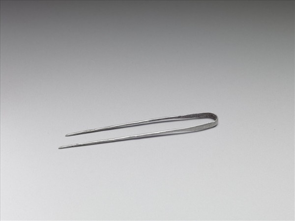 髮釵,銀銅合金,將一根長絲中間一段敲平呈長梭形後對折,兩端尖,全器光素無紋。
