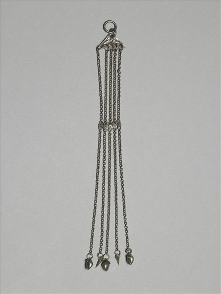 銀銅合金腰佩,整器為三角形金屬片連接金屬鍊條與墜角而成。三角形金屬片面飾蝶紋,一角連金屬環,三角金屬片下連細鍊條,鍊條下段以花形小飾片並聯五鍊條,鍊條尾端帶含苞花、葉片飾片為墜角。本器因金屬鍊細長,若佩於身上,將隨人體的動作而有擺動的美感。