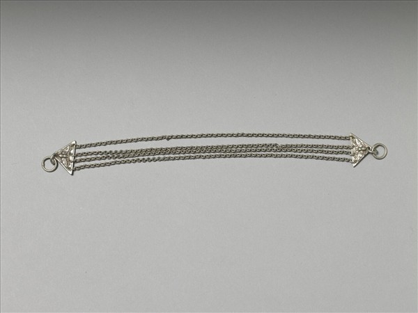 銀銅金合腰佩,整體主要將兩塊三角形金屬片以細金屬鍊連結而成器。金屬片外壁鏨飾蝶紋,兩端頂角各接圓環,兩金屬片間的有四細鍊。本器因金屬鍊細長,若佩於身上,將隨人體的動作而有擺動的美感。