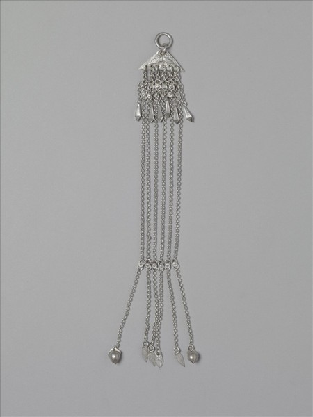 銀銅合金腰佩,整器為三角形金屬片連接金屬鍊條與墜角而成。三角形金屬片面飾蝶紋,一角連金屬環,底邊花形飾片與錐形墜角,鍊條下段以花形小飾片並聯六鍊條,鍊條尾端帶含苞花與葉形飾件為墜角。本器因金屬鍊細長,若佩於身上,將隨人體的動作而有擺動的美感。