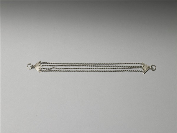 銀銅合金腰佩,整器為兩塊三角金屬片中以四細金屬鍊條相連而成。金屬片一角接圓環,外壁光素無紋。本器因金屬鍊細長,若佩於身上,將隨人體的動作而有擺動的美感。