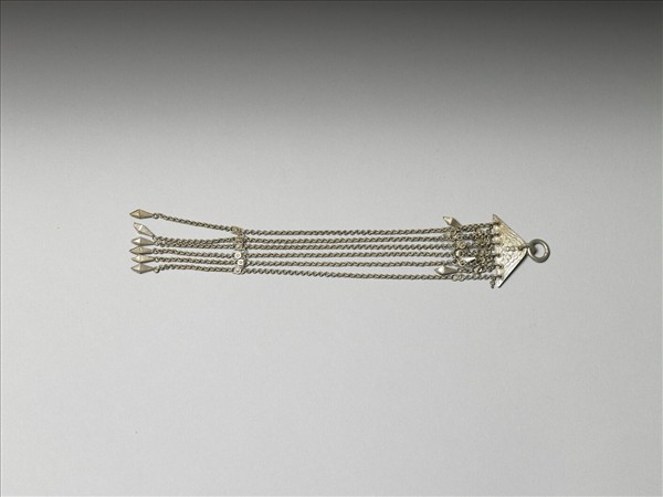 銀銅合金腰佩,整器為三角形金屬片連接金屬鍊條與墜角而成。三角形金屬片面飾蝶紋,一角連金屬環,底邊花形飾片與錐形墜角,鍊條下段以花形小飾片並聯鍊條,鍊條尾端帶錐形飾件為墜角。本器因金屬鍊細長,若佩於身上,將隨人體的動作而有擺動的美感。