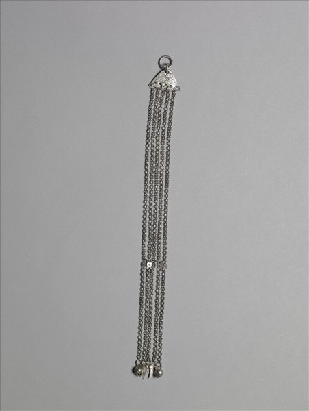銀銅合金腰佩,整器為三角形金屬片連接金屬鍊條與墜角而成。三角形金屬片面飾蝶紋,一角連金屬環,三角金屬片下連細鍊條,鍊條中段稍下以花形小飾片並聯五鍊條,鍊條尾端帶含花苞與葉片飾件為墜角。本器因金屬鍊細長,若佩於身上,將隨人體的動作而有擺動的美感。