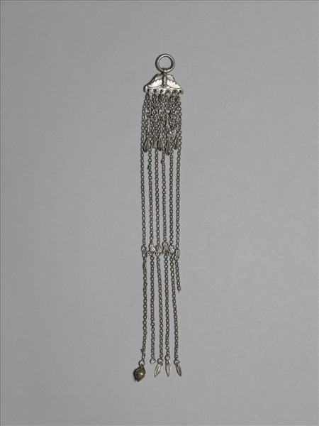 銀銅合金腰佩,整器為梯形金屬片連接金屬鍊條與墜角而成。梯形金屬片面飾蝶紋,短底連金屬環,長底邊花形飾片與八面體墜角,梯形金屬片下連細鍊條,鍊條中段附近以花形小飾片並聯六鍊條,鍊條有斷損,鍊條尾端帶花苞、葉形飾片為墜角。本器因金屬鍊細長,若佩於身上,將隨人體的動作而有擺動的美感。
