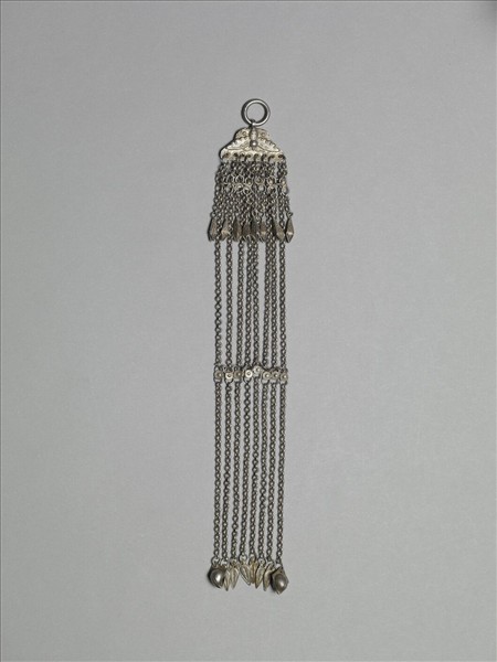 銀銅合金腰佩,整器為梯形金屬片連接金屬鍊條與墜角而成。梯形金屬片面飾蝶紋,短底連金屬環,長底邊花形飾片與八面體墜角,梯形金屬片下連細鍊條,鍊條中段附近以花形小飾片並聯八鍊條,鍊條尾端帶花苞、葉形飾片為墜角。本器因金屬鍊細長,若佩於身上,將隨人體的動作而有擺動的美感。