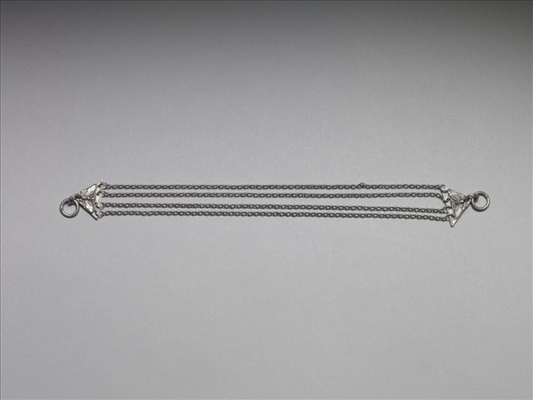 銀銅合金腰佩,整體主要將兩塊三角形金屬片以細金屬鍊連結而成器。金屬片外壁鏨飾蝶紋,兩端頂角各接圓環,兩金屬片間有四細鍊。本器因金屬鍊細長,若佩於身上,將隨人體的動作而有擺動的美感。