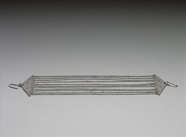 銀銅金合腰佩,整體主要將兩塊三角形金屬片以細金屬鍊連結而成器。金屬片外壁鏤空簡單樣式的八瓣花裝飾,其中兩邊鏨為連續波弧,兩金屬片間的細鍊共有十一條;金屬鍊細長。