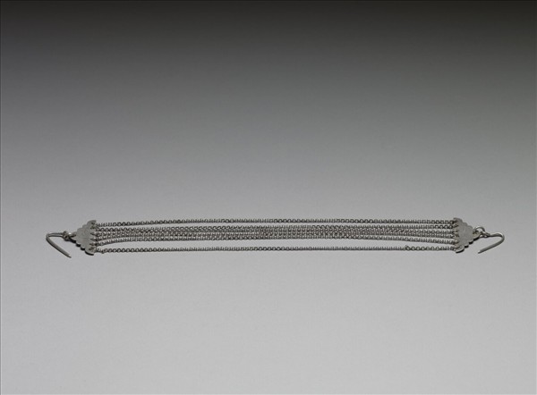 銀銅合金腰佩,整體主要將兩塊三角形金屬片以細金屬鍊連結而成器。金屬片一角扣連金屬鉤,外壁光素無紋,其中兩邊鏨為連續波弧,兩金屬片間的細鍊共有六條;金屬鍊細長。