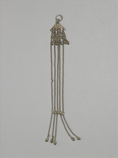 銀銅合金腰佩,整器為三角形金屬片連接金屬鍊條與墜角而成。三角形金屬片面飾蝶紋,一角連金屬環,底邊五錐形墜角,三角金屬片下連細鍊條,鍊條下段以花形小飾片並聯五鍊條,鍊條尾端帶錐形飾片為墜角。本器金屬鍊細長,佩於身上,有擺動的美感。