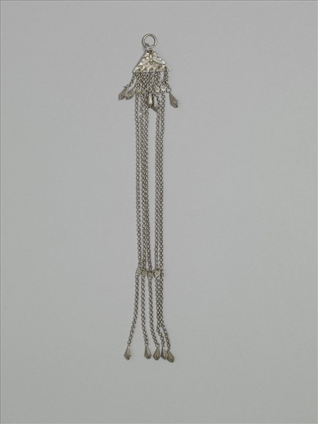銀銅合金腰佩,整器為三角形金屬片連接金屬鍊條與墜角而成。三角形金屬片面飾蝶紋,一角連金屬環,底邊花形飾片與五錐形墜角,三角金屬片下連細鍊條,鍊條下段以花形小飾片並聯五鍊條,鍊條尾端帶錐形墜角。本器金屬鍊細長,佩於身上,有擺動的美感。