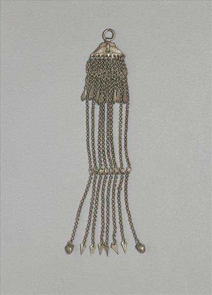 銀銅合金腰佩,整器為梯形金屬片連接金屬鍊條與墜角而成。梯形金屬片面飾蝶紋,短底連金屬環,長底邊花形飾片與八錐形墜角,梯形金屬片下連細鍊條,鍊條中段附近以花形小飾片並聯八鍊條,鍊條尾端帶花苞、尖葉形飾片為墜角。本器金屬鍊細長,佩於身上,有擺動的美感。