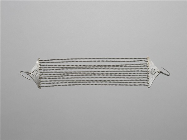 銀銅合金腰佩,整體主要將兩塊三角形金屬片以細金屬鍊連結而成器。金屬片外壁鏤空十瓣花,花旁陰線刻卷草,三角形金屬片兩邊鏨飾鋸齒,其間細金屬鍊有十二條。本器因金屬鍊細長,若佩於身上,將隨人體的動作而有擺動的美感。