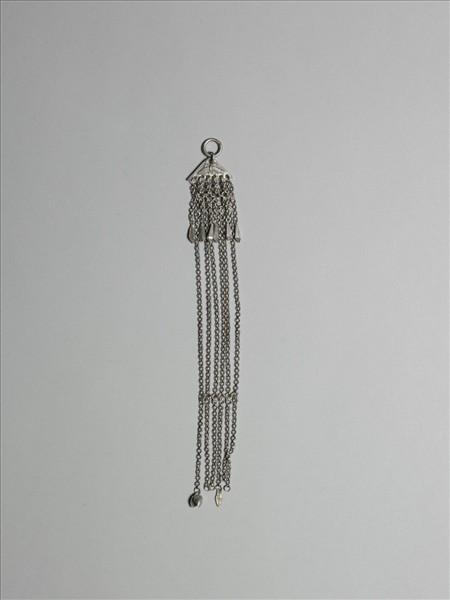銀銅合金腰佩,整器為三角形金屬片連接金屬鍊條與墜角而成。三角形金屬片面飾蝶紋,一角連金屬環,底邊花形飾片與六錐形墜角,三角金屬片下連細鍊條,鍊條下段以花形小飾片並聯六鍊條,鍊條尾端帶含苞花、葉片飾片為墜角,但墜角缺損,僅存花苞、葉各一。本器因金屬鍊細長,若佩於身上,將隨人體的動作而有擺動的美感。