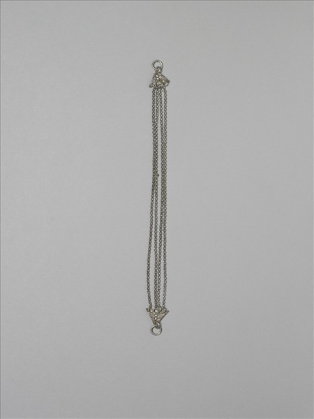 銀銅合金腰佩,整體主要將兩塊三角形金屬片以細金屬鍊連結而成器。金屬片外壁鏨飾蝶紋,兩金屬片間的有四細鍊。本器因金屬鍊細長,若佩於身上,將隨人體的動作而有擺動的美感。