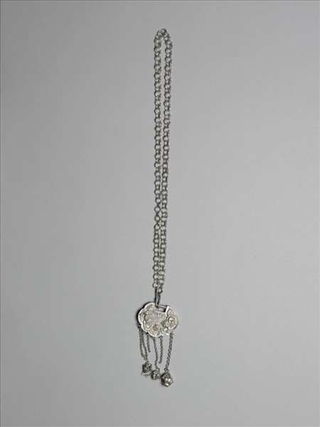 銀銅合金鎖,外型近如意雲頭形,帶長鍊條。鎖外壁鏨飾二獅戲球圖樣,二獅分別位於兩側,球在外壁中下方,上方一圓內有「日」字,該圓並雕飾光芒外輻有如太陽。鎖下細金屬鍊帶墜角,但有些墜角已脫落。