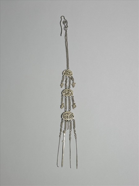 銀銅合金墜飾,全器分為三層,每層均為一近橢圓形金屬牌,彼此以細鍊相連,最上一層面積最小,鏨刻木葉紋,兩側各帶一墜角。中層林間人物,帶二墜角;最下層盆花珍寶紋,四細鍊連耳挖、修眉刀等日用小道具為墜角飾物。