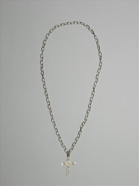 銀銅合金項鍊,墜飾片作片狀十字架,十字架一面陰刻卷草紋,另面在十字架交叉處陰線刻十字,四周分刻「耶」、「苏」、「救」、「主」四楷字,「主」字下飾小段卷草紋。