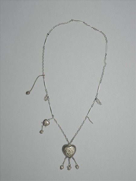 銀銅合金項鍊,項鍊以小金屬圓環及細長梭形金屬飾件相連而成。鍊上並連短小墜角,頗見細緻秀氣。墜飾為外鼓的心形,外壁皆有心形開光。一面開光內連珠紋地,鏨飾花蝶;另一面開光內側有「文明」二楷字。字斜,上方飾竹葉。心形墜飾並帶三墜角。