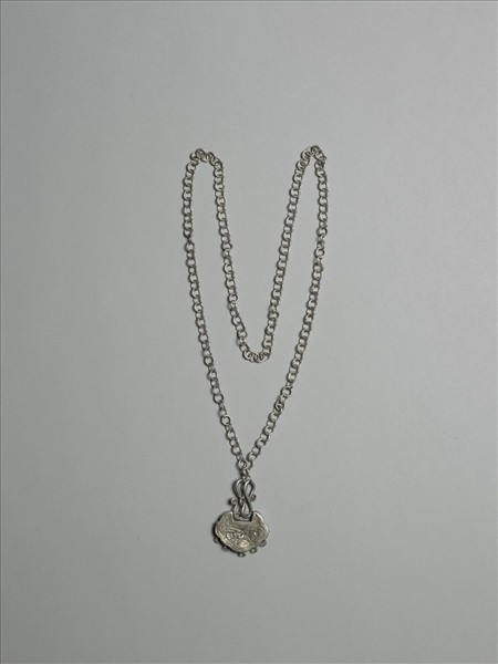 銀銅合金鎖,外型近如意雲頭形。以兩S形條狀金屬鉤與長鍊條相扣連。鎖側壁五小環,應為連接墜角之用。其外壁則一面連珠紋地折枝花;一面連珠紋地雙旗交叉,旗面飄揚,甚具動感。