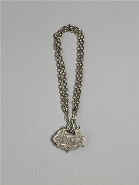 銀銅合金鎖,外型近如意雲頭形。帶長鍊條,鍊條雙股,與鎖連結處為S形金屬條。鎖外壁兩面沿邊框為如意雲形開光。一面開光內又有長形開光,開光內印「金馬玉堂」四字,漢代的玉堂殿及金馬門是待詔學士議事的地方,後用以指稱翰林院。另一面開光內連珠紋地,仕宦童僕立於山林樓閣間。