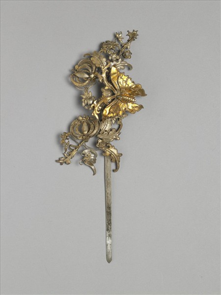 銀銅合金簪,簪挺尖且光素,首部黏焊一S形金屬條,並由此金屬條旁出金屬花葉,花葉整體走向呈現亦如金屬條之動勢。花葉繁茂,並間雜果實、蝴蝶。其上並有一大隻金色蝴蝶,展現出簪面的富麗。