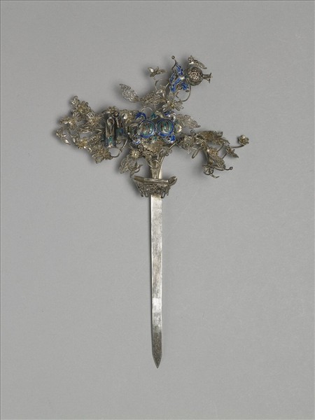 銀銅合金簪,簪挺尖且光素。簪首為盆花,花器壁雕鏤細緻。花葉略出三莖,每莖花葉繁茂,葉片以金屬線彎折焊接而成,做出如鏤雕般的透氣感。其上並有石榴,中央圓形金屬片各雕鏤「日」、「月」二字。填飾藍、綠色琺瑯料,在整器銀白的色調中,頗具「點睛」之效。