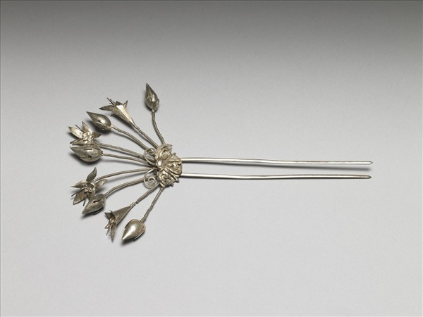 銀銅合金簪,挺雙股,首黏飾張翅蝴蝶,上出九彈簧,每條彈簧皆黏一飾物,飾物作花形,中央一股為蓮,兩側則對稱飾以同樣順序之花,以蓮為中心,向外順次為蘭花、蓮、百合、蓮。彈簧長,插飾時可因擺振而生動感。