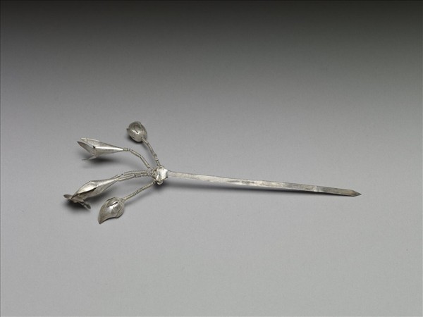 銀銅合金簪,簪挺尖且光素,首接彈簧四股,每股分接一飾件,其中兩股接未開之蓮花,另兩股接如百合之花朵。因飾件與簪挺以彈簧相接,故插飾時可因擺振而生動感。