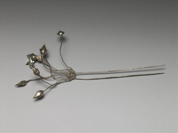銀銅合金釵,挺兩股,首飾蝴蝶,上出長彈簧九股,接以花卉飾件。因飾件與簪挺以彈簧相接,故插飾時可因擺振而生動感。