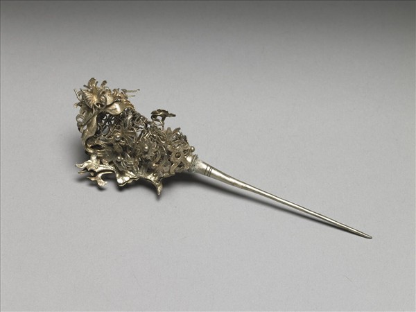 銀銅合金簪,簪挺由小漸大如棒狀,較大端飾弦紋三道,簪首先繞纏金屬線作團狀,金屬線團密度小,空間甚多,表面接黏花葉、蝴蝶,花心皆作圓珠。整體設計有華麗之感。