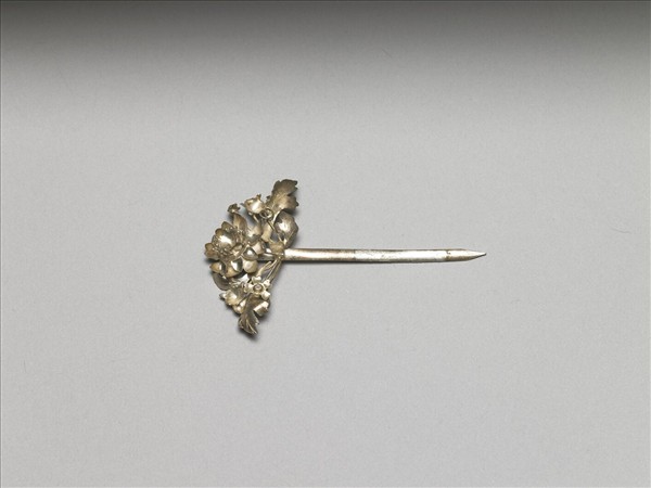 銀銅合金簪,簪挺尖且光素,簪首以花葉為飾,以一盛開花朵作為中心點,再由層層漸小的葉片推疊出立體花朵造型,以此為主調,旁飾以葉片與小花,整體呈扇形分佈。