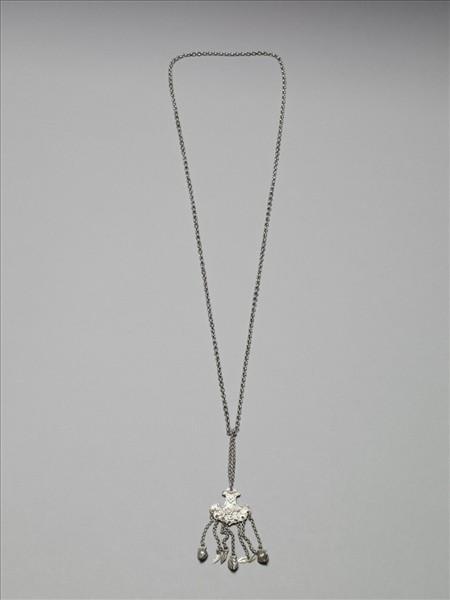 銀銅合金銀鎖片,以兩條細銀鍊垂掛於一圈銀鍊下方。鎖片為如意雲頭形,下端帶七圓孔,各接一墜角。兩端與中間墜角為桃實形,餘皆為扁平葉形墜角。銀鎖片表面飾四瓣花紋與葉紋。