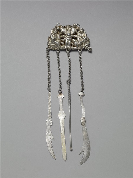 銀銅合金腰飾,頂端為一半圓形鎖片,鎖片主題為三老者,中央老者袒胸露腹,雙首高舉,神態歡欣;其左右二老同樣笑容可掬,左側者一手持拂塵,一手捻鬚,意態悠閒。 此鎖片皆於雙面鏨刻同樣紋飾,鎖片下方接五圓環,各以細銀鍊接一墜角,其中一銀鍊已失。其中一墜角為劍形,一墜角為耳挖,兩墜角為大彎刀形。