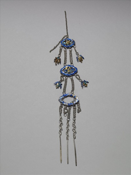銀銅合金腰飾,由上而下共區分為三層,各有一塗敷藍琺瑯料之如意雲形飾片,飾片間皆以金屬細鍊相接。頂端與中間飾片中央皆繞縛花朵、枝葉,其兩側各接有瓜果形墜角,墜角上塗敷各色琺瑯料。底端飾片下接有挑牙、小刀等,其上端皆以兩金屬絲交叉纏繞。