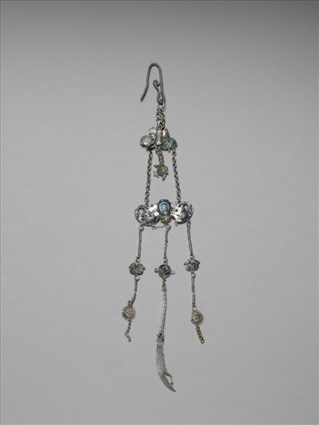 銀銅合金腰飾,頂端為一彎鉤,下接蝴蝶形飾片,並有一果實形墜角。蝴蝶形飾片下方接一展翅蝙蝠,蝠身下方連有三條墜角,中段各有一圓形飾片,底端再接一墜角。中間墜角為長柄彎刀,兩側為花朵形墜角。飾片表面作工細緻,表面皆施淺藍、綠、黃各色琺瑯料,色彩繽紛。