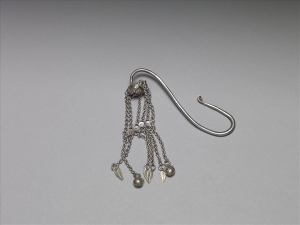 銀銅合金耳墜,頂端彎鉤下接六條細銀鍊,各鍊間有一菊花形銀片,並以銀片將各鍊串聯起來。銀鍊底端皆帶一墜角,分別為兩圓球與四扁平葉形墜角。