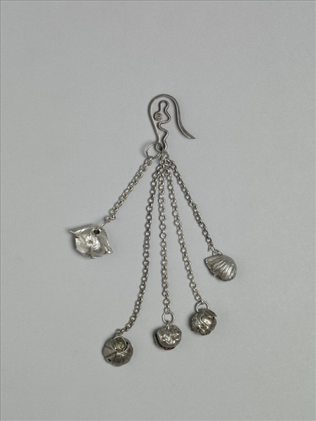 銀銅合金飾件,頂端彎鉤下接五條細銀鍊,銀鍊底端各接一墜角,分別為貝殼形與四形狀各異之墜角。