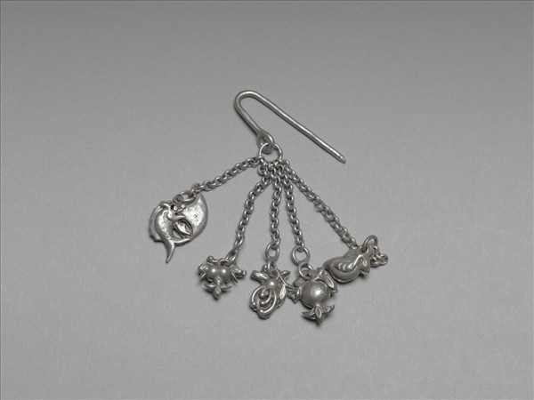 銀銅合金飾件,頂端彎鉤下接五條細銀鍊,銀鍊末端各有一墜角,分別為魚形、果實形…等等,造型生動富變化。