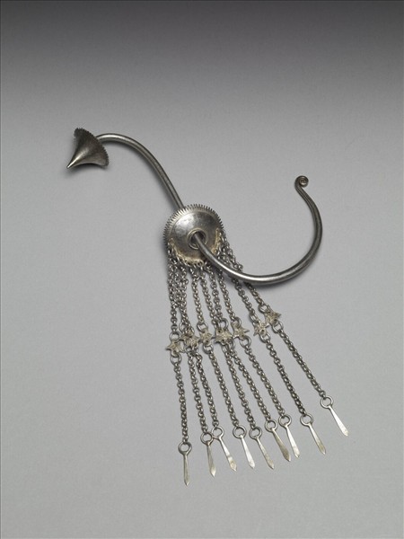 銀銅合金飾件,頂端為一S形彎鉤,彎鉤頂端為一帶鋸齒邊緣之圓錐體,中段穿有一圓片,其邊緣有九圓環,分別接有一細銀鍊,各鍊中間有一葉形銀片。銀鍊底端皆為扁平刀形墜角。