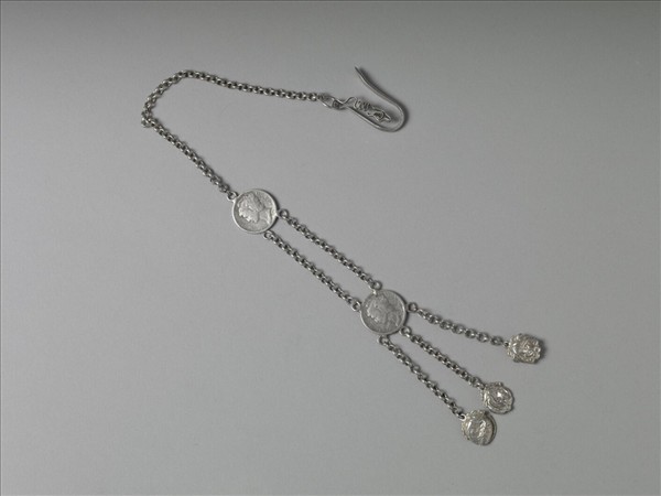 銀銅合金銀腰飾,上方帶一彎鉤,細銀鍊下方以兩圓形硬幣將整件區分成三層。硬幣皆為10美分,一面飾帶翼自由女神頭像,環繞「LIBERTY」字樣,並標記年份,第一枚硬幣為1920,第二枚為1918年。另一面飾環繞橄欖枝的束棒,邊緣有「UNITED STATES OF AMERICA ONE DIME」字樣。第二硬幣下端接三銀鍊,銀鍊各接一墜角,作工繁複。