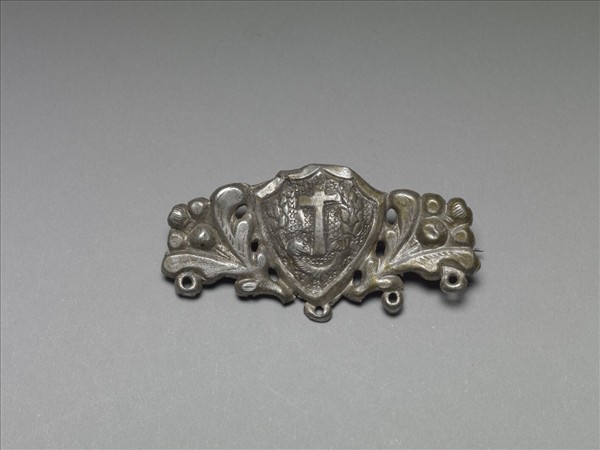 銀銅合金飾件,中央為一盾牌形狀,兩旁飾對稱花葉紋,並帶有三圓孔以供懸掛。盾牌表面飾淺粟米銀珠地紋,中央飾十字紋。